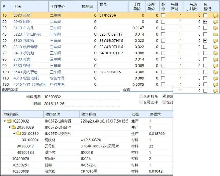 用料计划,上面是工艺路线。 2、字段解释——工艺路线