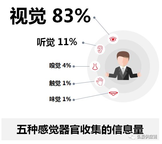 人眼收集的信息,占了五感(五种感觉器官:视觉、听觉、嗅觉、味觉、触觉)总共收集信息量的87%。目视无疑是收集信息最强有力的工具。