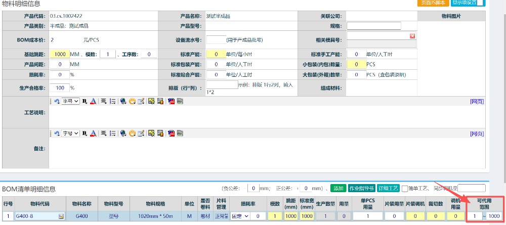 进入到编辑页面后,输入固定的跳距,模数,跳距固定为1000,模数为1,如下图所示: 固定跳距模数原因说明:由于半成品为卷料,单位固定为M2(平方米),因此设置材料比例为1比1设置。