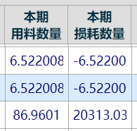 ​2、本期损耗数量为负数,则表示实际领料数值小于标准领料数值,也就是说料领少了,或者BOM标准用量大了,如果本期损耗数量数值+本期用量数值等于0,则说明该明细未发领料。