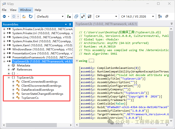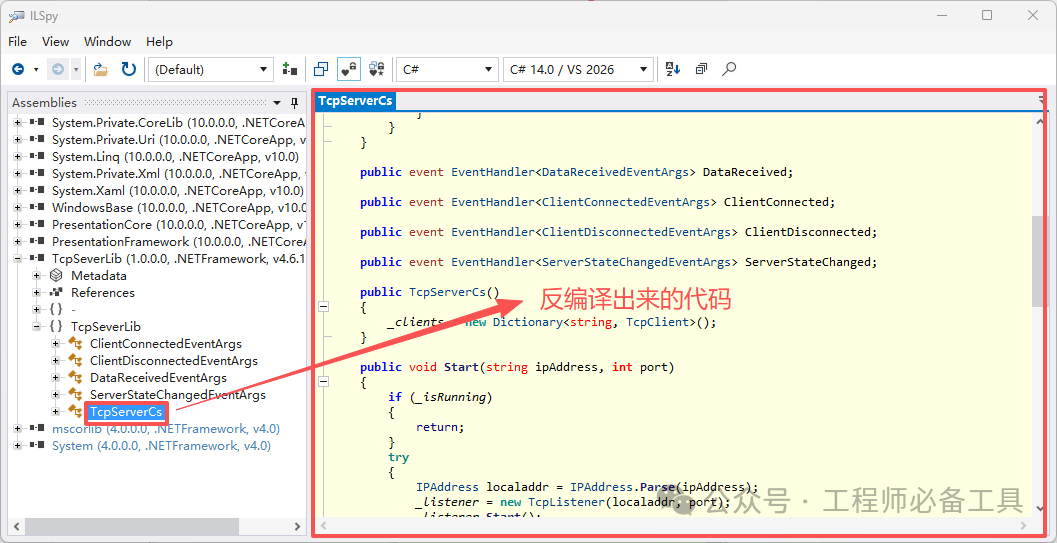 启动ILSpy,点击顶部菜单栏「File」→「Open」(或快捷键Ctrl+O);在弹出的文件选择窗口中,找到需要反编译的文件(.dll或.exe),选中后点击「打开」;加载完成后,左侧「Assembly Explorer」(程序集浏览器)中,会显示该文件的所有命名空间、类、方法,展开即可查看结构。在左侧程序集浏览器中,展开命名空间,找到你想查看的类(比如TcpServerCs);点击该类,右侧主窗口会自动显示反编译后的C#代码(默认显示C#,可切换);Tips:ILSpy的代码还原度很高,会尽可能保留原始代码的结构、变量名和注释,可读性极强,几乎和原始源码一致,不用费心修改就能直接使用。