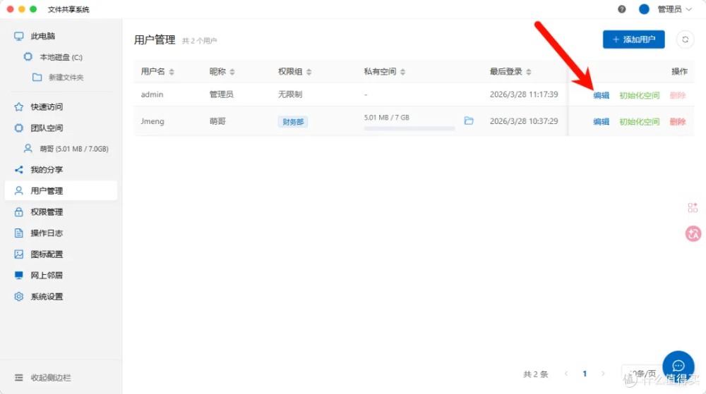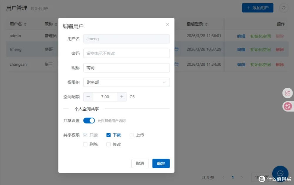 添加/删除普通用户,灵活配置访问权限、存储配额、专属密码,一人一账号,权责分明。