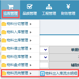 在系统找到“仓库管理” 》“物料流向管理” 》“物料出入库流水明细”页面进入查询。