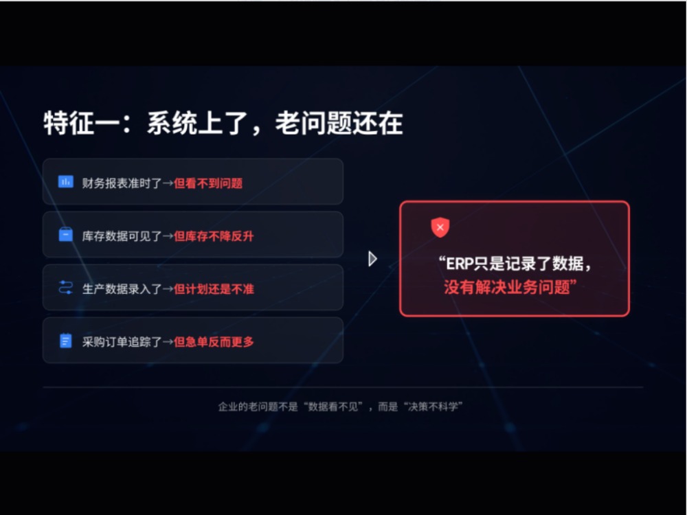 自检清单今天给大家一个自检清单。如果你发现企业中了3个以上,说明你的ERP基本是在亏本运行。 特征一:系统上了,但老问题还在财务报表能出了,但老板还是看不到关键问题;库存可以实时查了,但库存不降反升;生产数据录进去了,但计划还是不准。ERP只是记录了数据,没有解决业务问题。 特征二:员工同时用着两套系统采购部:...