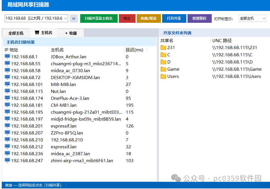 ​​能够查看及访问局域网内其它电脑开启的共享文件夹,能够显示出局域网内其它电脑的主机名,定位特定IP时能用上点击「扫描共享及主机名」,程序同时做两件事:扫描共享文件夹:并发Ping整段C类网段(.1~.254),对在线主机执行netview枚举共享,自动过滤系统隐藏共享($结尾)和打印机共享解析主机名:每个Ping成功...