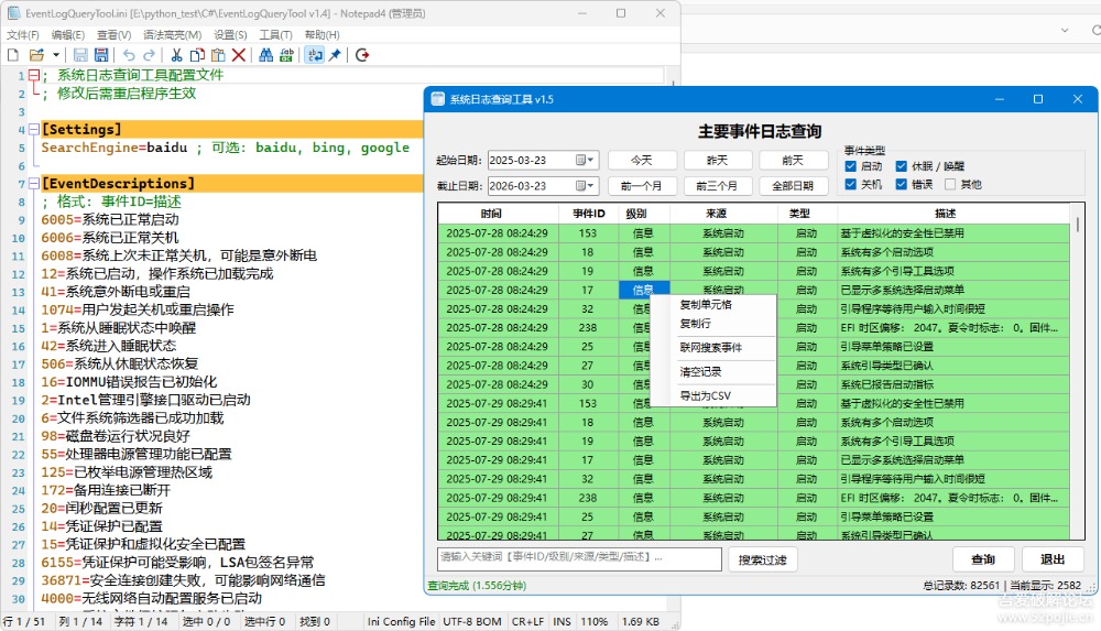 分享一个自己做的一款轻量级的Windows事件日志查询工具,提供友好的界面, 可以让你一键筛选所需事件,并利用分层智能缓存技术,实现秒级响应,即使查询几个月的数据也能流畅体验。 本工具其实特意为了查询开关机来设计的,最后不知咋的就变成下面这样了。。。。 系统日志查询工具v1.5.exe,已更新,欢迎提出意见,求个...