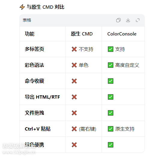 一、工具简介:ColorConsole是一款经典、轻量、免费的WindowsCMD命令提示符增强/替代工具,由NenadHrg开发,主打彩色界面、多标签、命令收藏、结果导出,完全兼容原生CMD。 二、核心功能:(完全超越原生CMD) 1.多标签页控制台 单窗口多命令行会话,一键切换,彻底解决原生单窗口局限。 2...