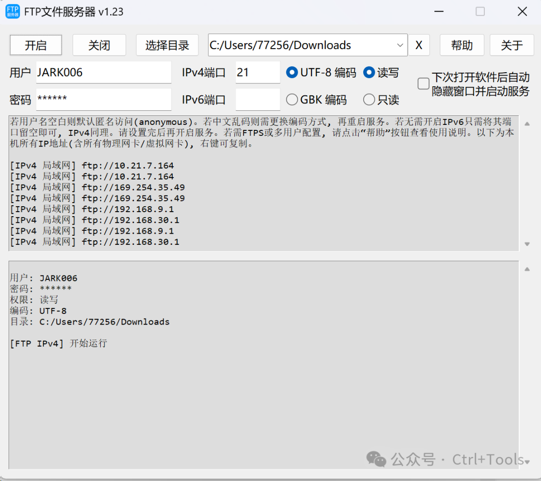 前言FTP文件传输神器,一键启动!工具介绍:FtpServer今天推荐的实用工具——FtpServer,一键启动FTP服务,开启文件传输,支持多人传输,可配置账号密码、权限和分享文件路径。网站链接:https://github.com/jark006/FtpServer工具展示1.基本使用工具下载后双击运行一键开启FT...