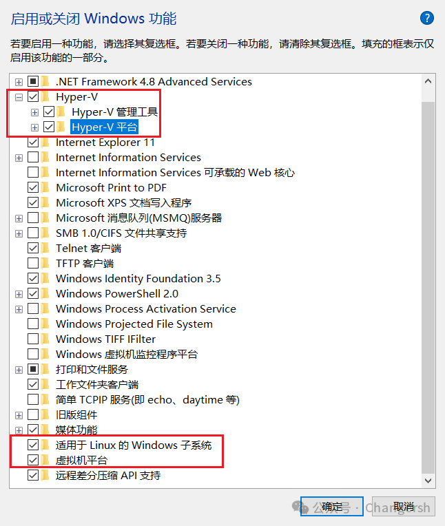 Docker+wsl配置Windowswin+Q搜索:启用或关闭Windows功能打开Hyper-V、适用于Linux的Windows子系统、虚拟机平台(后面所有的报错基本都是因为Hyper-V没有被全部打开,因为之前的一些设置,这里不能全部打开,后面用命令强制开启)开启后会提示重启,重启即可安装Linux子系统在命令...
