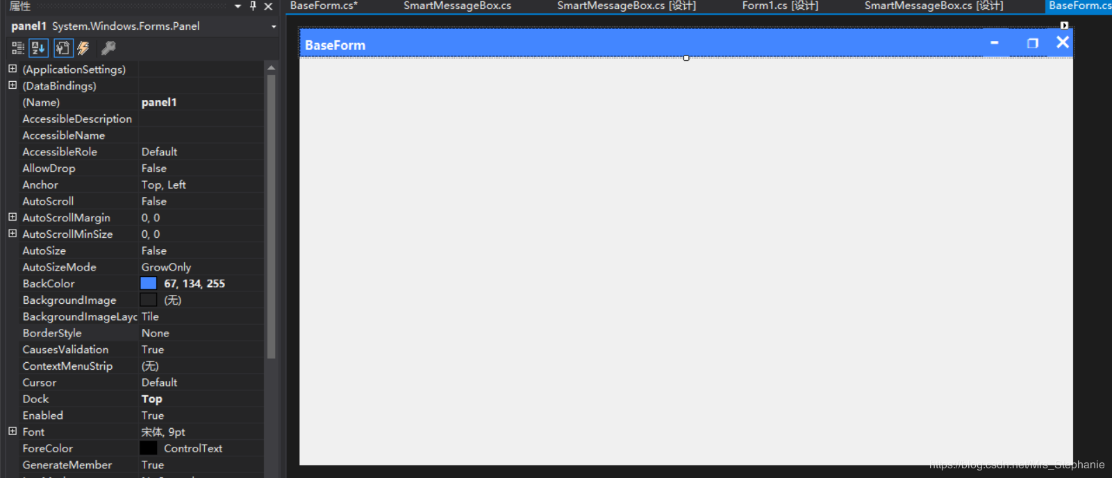 先将原生窗体设置成无边框,FormBoderStyle设置成None,然后添加一个panpel控件设置成窗体的的标题栏: