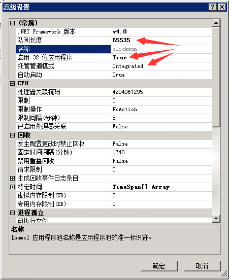 [3] Recycling->Regular Time Interval设置为0(禁用应用程序池定期自动回收)