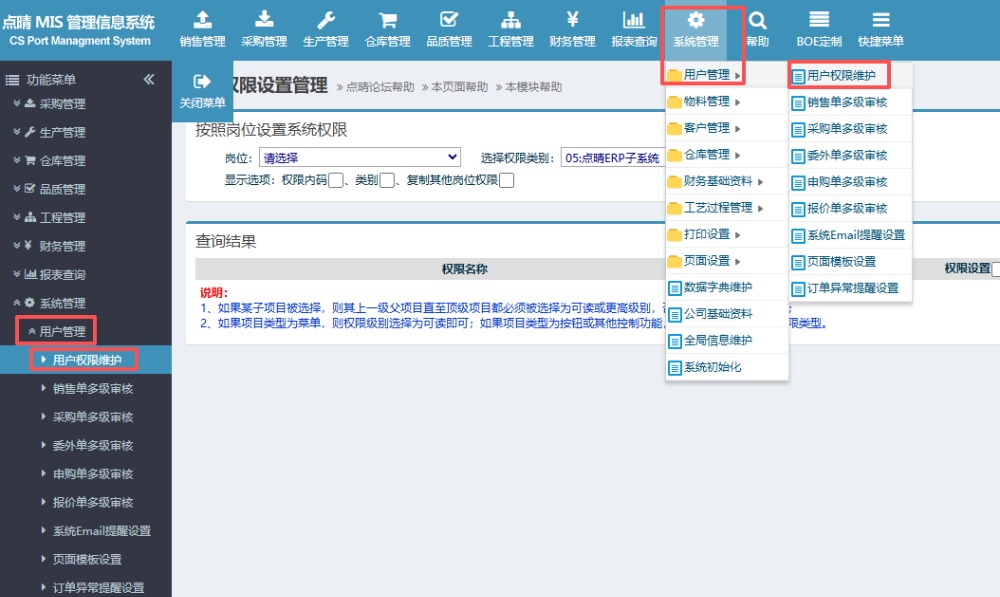 :请问如何对点晴ERP/OA/PMS/WMS/进销存等系统中所有用户岗位根据菜单来查看或一次性批量设置权限?