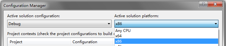 由于Chrome是原生程序,目前CefSharp还不能做到32位和64位自动识别,不能使用默认的AnyCPU的编译选项,需要修改一下配置管理器,改成x86或x64才行。