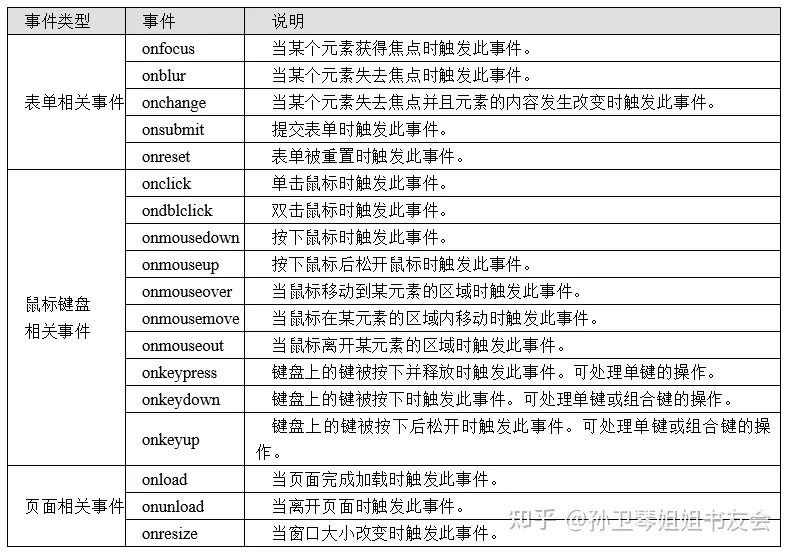 表1列出了常用的事件,对这些事件的触发时机作了说明。这些事件可分为三类:表单相关事件、鼠标键盘事件、页面相关事件。 表1 JavaScrip脚本可以处理的事件