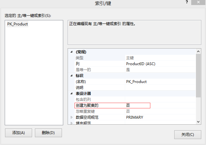 在SQL Server中,主键字段上默认创建聚集索引,删除主键的聚集索引。