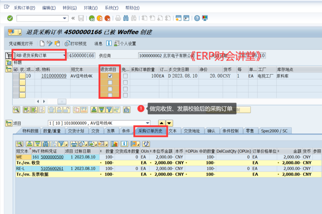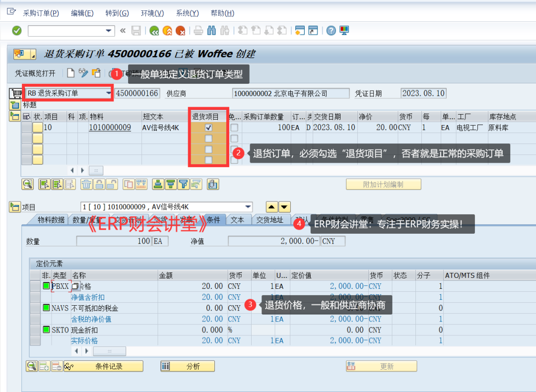 第一步,创建退货采购订单。一般情况下,企业会定义单独的订单类型,以便同正常采购订单区分。