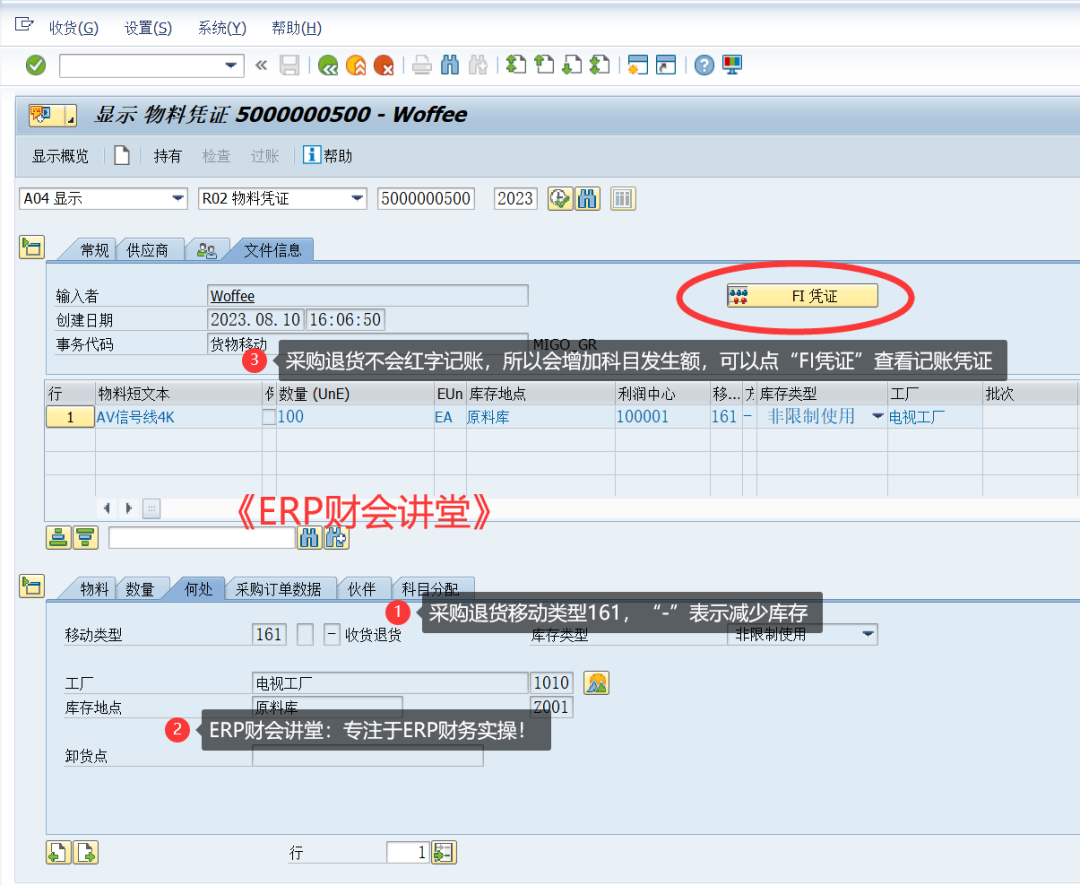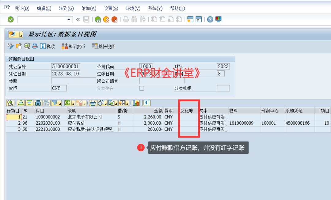采购退货,系统不会红字记账,所以会虚增会计科目的借贷发生额,查看FI凭证如下: