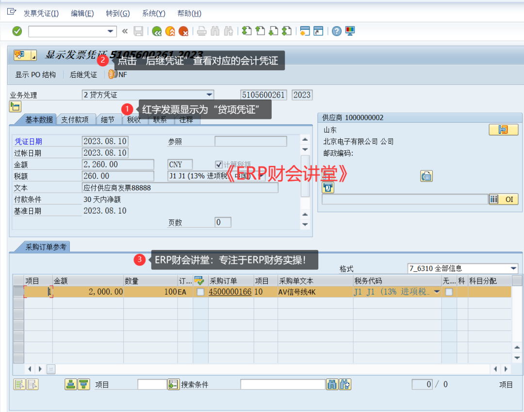 第三步,发票校验。采购退货订单的发票校验同正常的采购订单一样,通过MIRO来做。一般情况下,供应商开票时会将正常采购和退货进行合并,开具蓝字发票,不会单独开具红字发票。这里,我们演示红字发票,大家可以关注一下记账凭证。