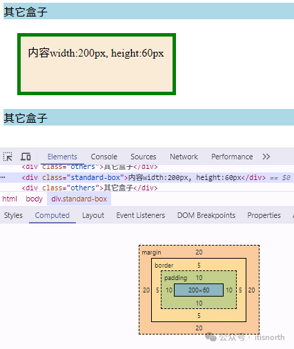 定义了标准盒子的宽度为 200px,高度为 60px,同时定义了它的边框为 5px,外边距为 20px,填充为 10px。
