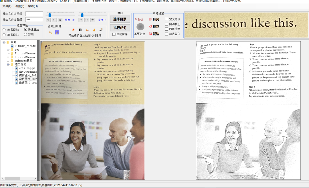 软件名字叫Picture Cleaner,大小在20MB左右。它是一个无广告且免费的绿色软件。它支持图像漂白,文档四角检测、变形校正、和规格化尺寸及方向输出。