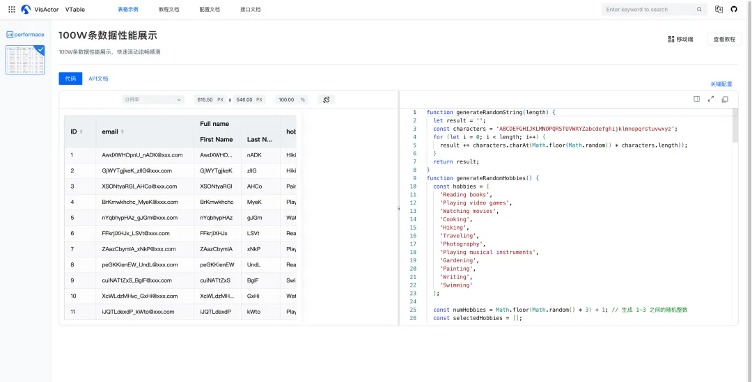 这个组件的性能相当出色,操作起来特别流畅。我刚刚测试了一下,处理 100万 条数据的时候,滚动过程中既没有出现白屏,也没有感觉到明显的卡顿。值得一提的是,Canvas 本身就具备支持虚拟滚动的优势,因为它只渲染当前视图范围内的图像