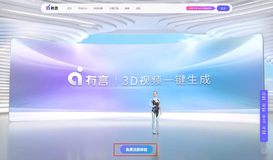 打开电脑,在浏览器地址栏输入有言3D视频网址(www.youyan3d.com/?from=gzgtxai)进入主页,点击【免费注册体验】。