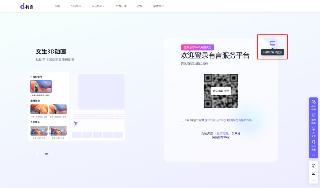 进入有言注册登录页面,点击登录界面的右上角【手机号/账号登录图标】。
