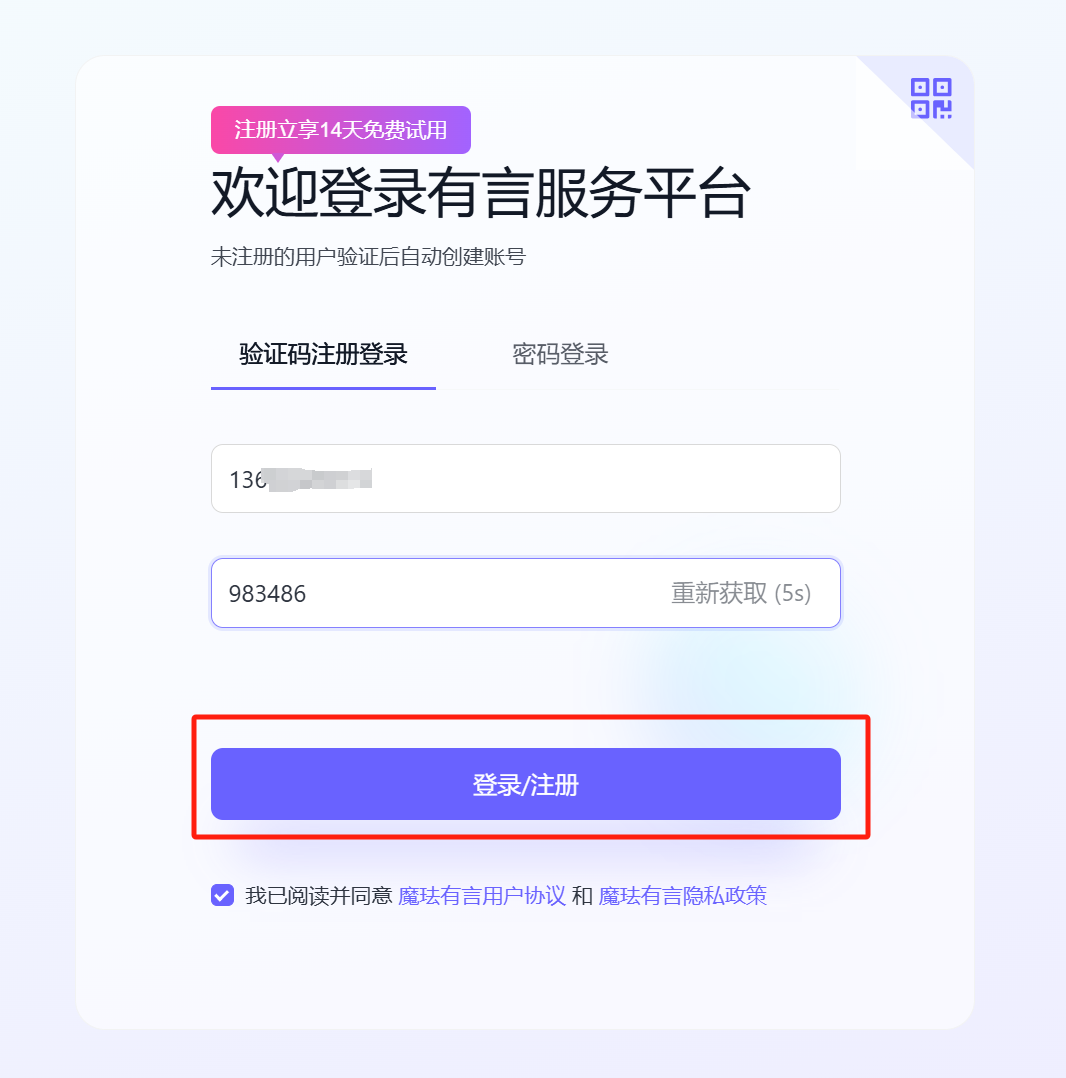 进入手机号验证码注册登录界面,输入手机号+验证码,勾选阅读并同意用户协议,点击【登录/注册】。