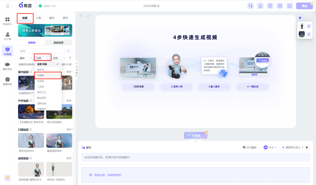 进入3D数字人视频创作界面,左侧编辑窗口默认显示【场景】-【场景库】界面,锅头在这里选择风格为“中国风”。