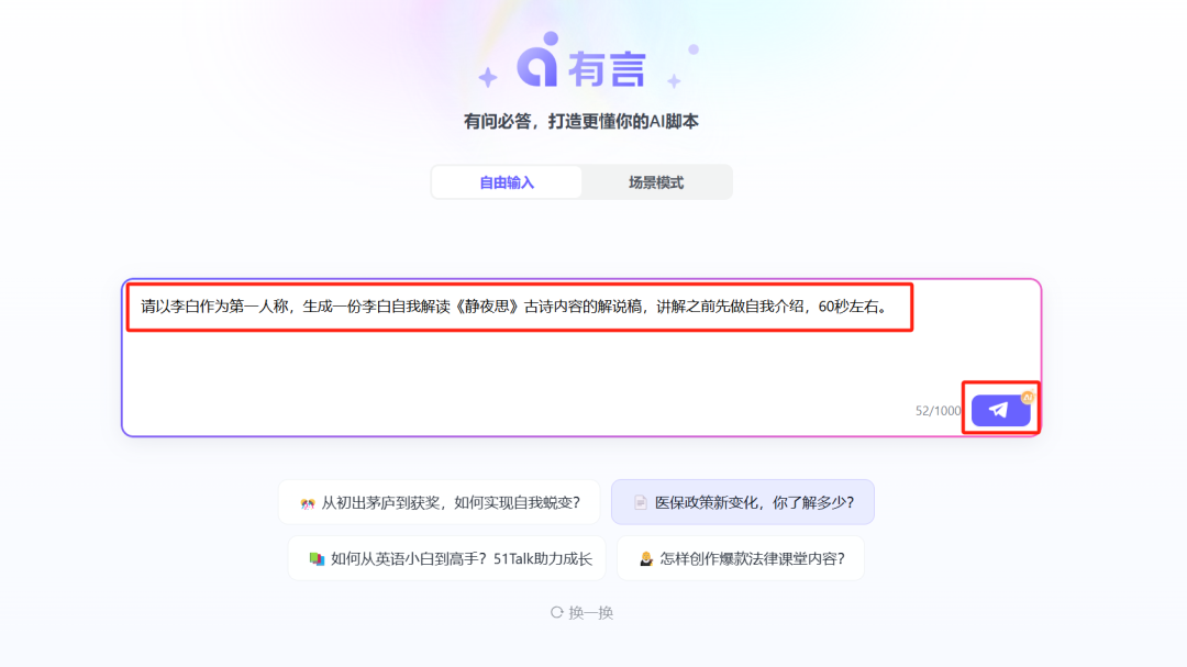 进入Ai生成脚本界面,输入AI脚本提示词,点击【发送图标】。