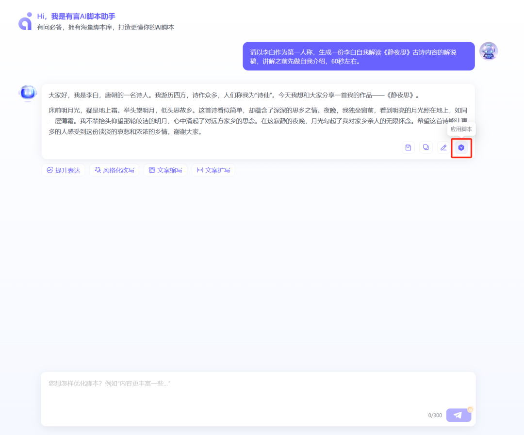 进入脚本创作页面,不到10秒钟脚本创作就完成了。若对脚本不满意可以选择提升表达、风格化改写、文案缩写和文案扩写,同时支持自定义描述优化脚本。锅头对AI本次创作的脚本比较满意,直接点击【应用脚本图标】。