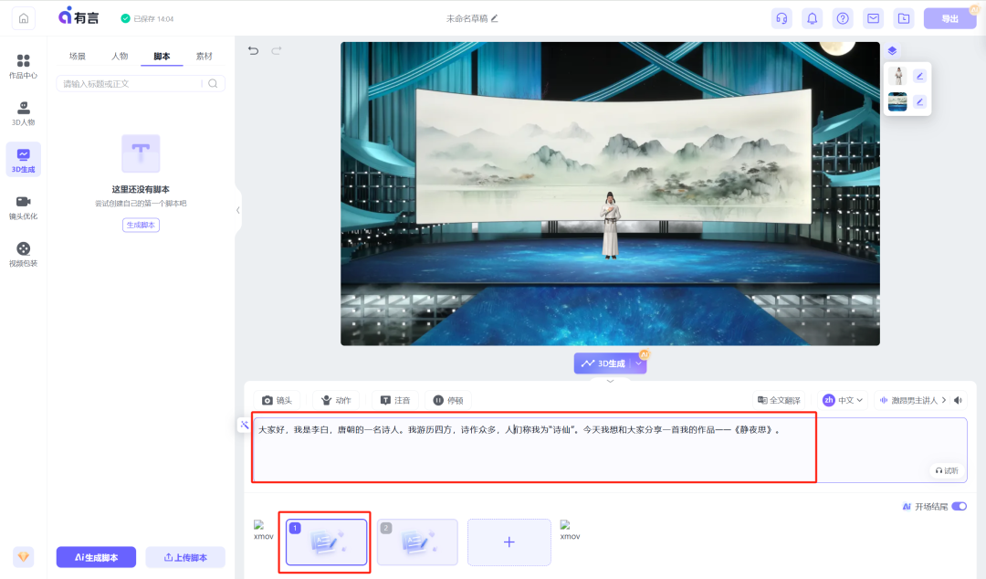 应用脚本成功后,可以看到3D数字人视频编辑界面自动增加了视频片段和脚本内容。有言平台基于视频场景和时长,自动分成了2个视频片段和2段脚本。