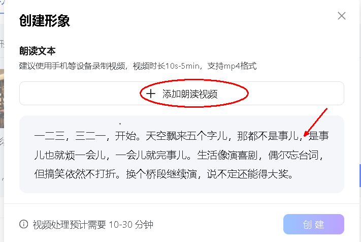 平台会让你上传一段视频,语音需要使用下图中的文字,读完大概 30 秒首先在纳米搜索中点击"创建形象":