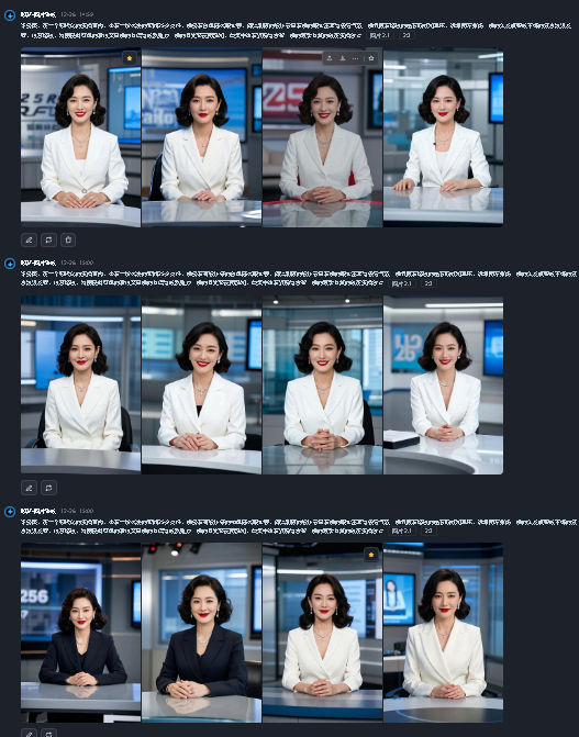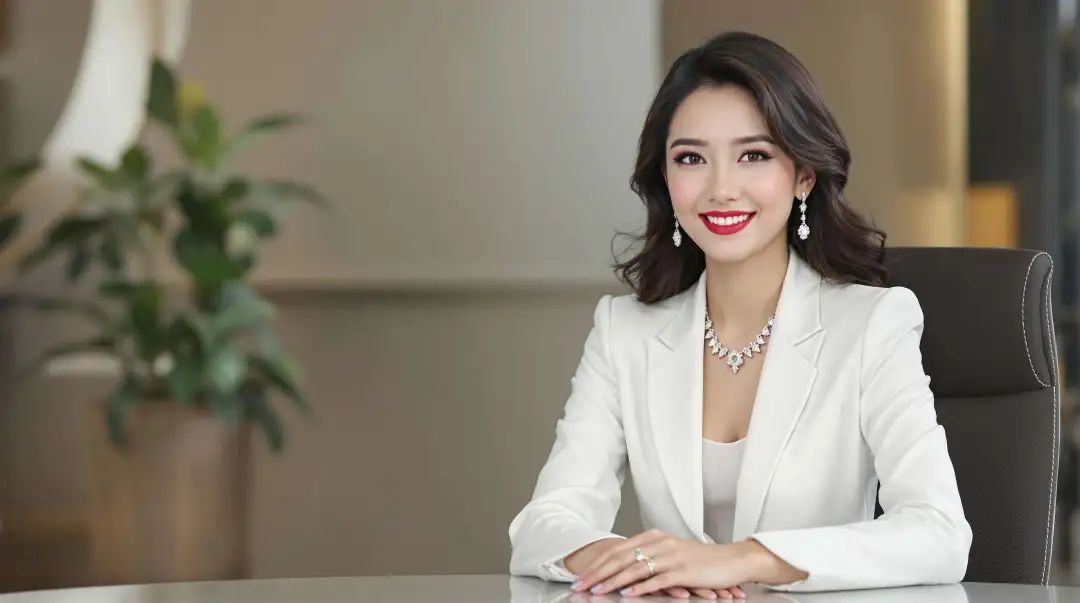 我让 kimi 写了段绘图提示词:“半身照,在一个现代化的演播室内,坐着一位端庄的亚洲 25 岁女性,她身着有设计感的纯色高端职业装,简洁利落的设计彰显着她的职业素养与领导气质。她佩戴着精致的钻石项链和耳环,优雅而不张扬。她的头发梳理成干练的复古波浪发型,妆容精致,特别是鲜红色的唇妆突显她的自信与成熟魅力。她的目光坚定而温和,微笑中透着沉稳与睿智。她的双手自然的放在演播台上”