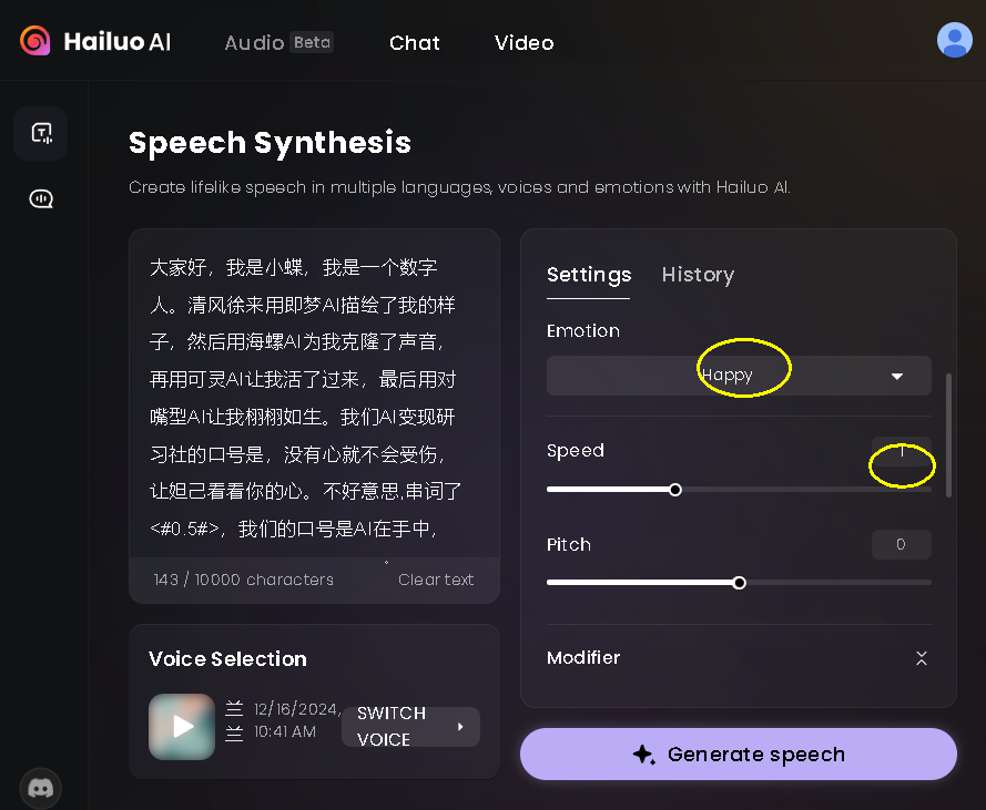来到海螺海外版,选择之前克隆的一个音色,录入台词,得到配音
