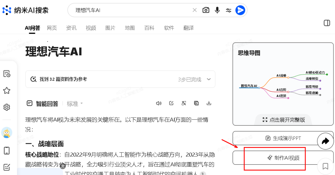 搜索完信息后,右边有一个“制作 AI 视频”