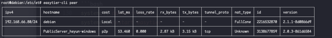 同理,如果需要查看节点信息,可以使用docker exec -it easytier easytier-cli peer命令