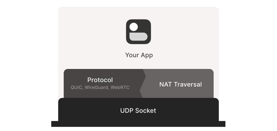 某些协议(例如 WebRTC)将 NAT 穿透与其他部分紧密集成。但如果你在构建自己的协议, 建议将 NAT 穿透作为一个独立实体,与主协议并行运行 ,二者仅 仅是共享 socket 的关系,如下图所示,这将带来很大帮助: