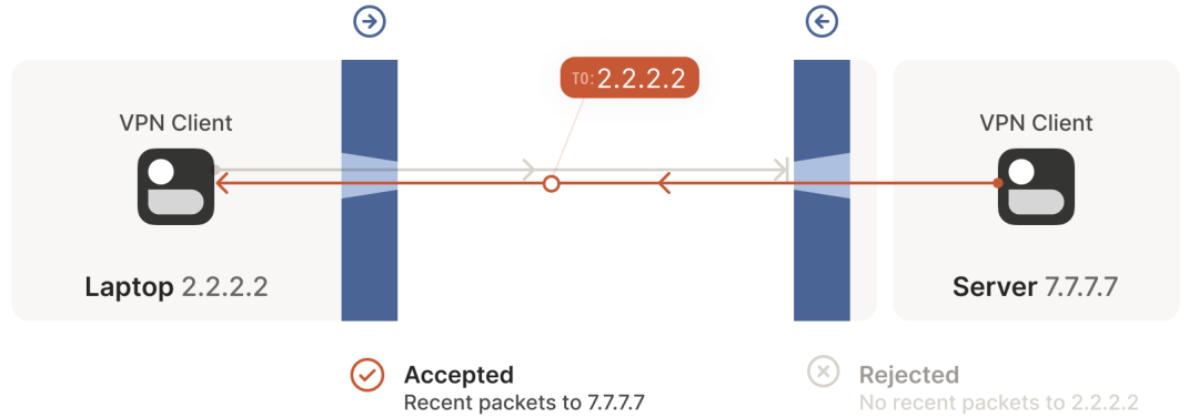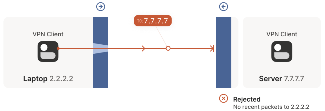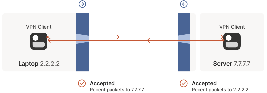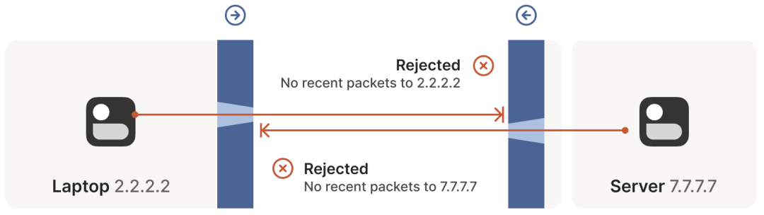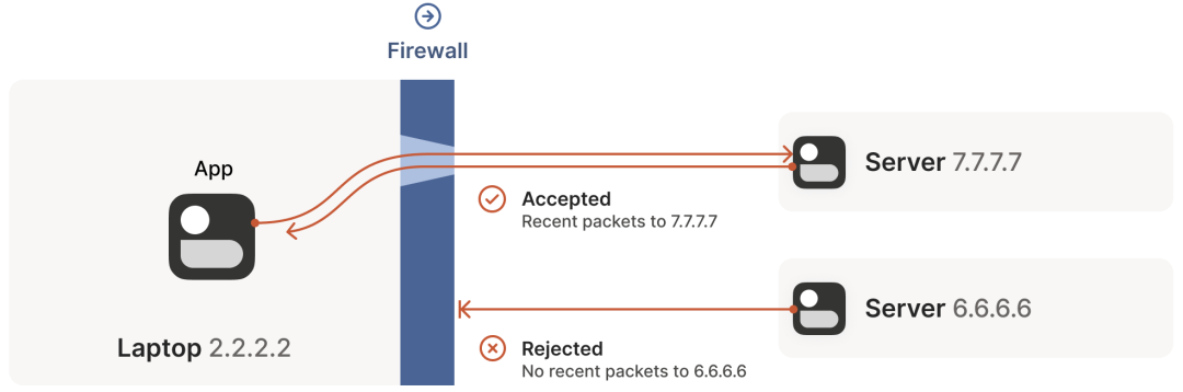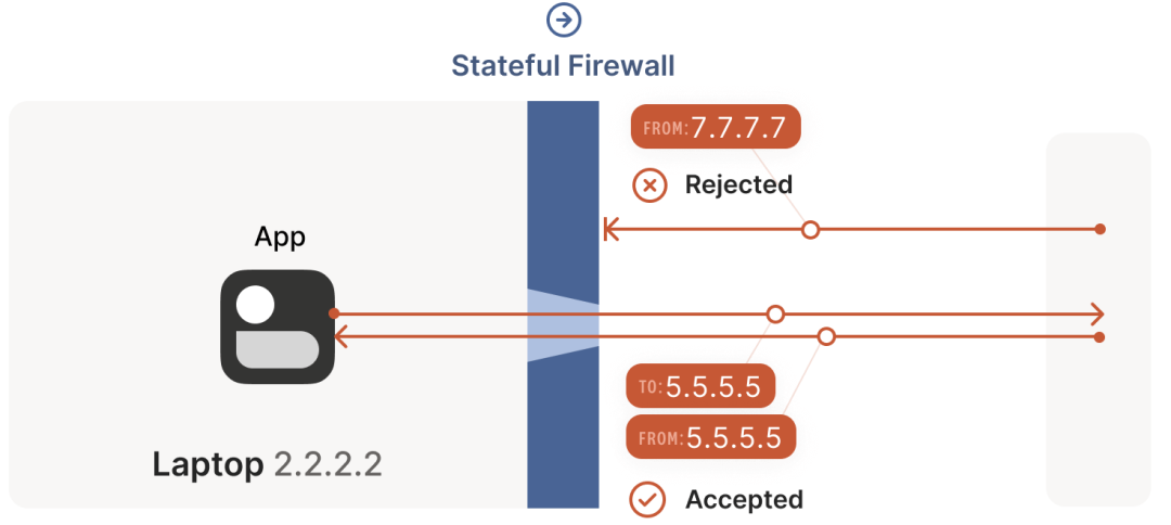 笔记本电脑中自带了一个防火墙,当该防火墙看到从这台机器出去的 2.2.2.2:1234 -> 5.5.5.5:5678 包时,就会记录一下: 5.5.5.5:5678 -> 2.2.2.2:1234 入向包应该放行。 这里的逻辑 是:我们信任的世界(即笔记本)想主动与 5.5.5.5:5678 通信,因此应该放行(allow)其回包路径。