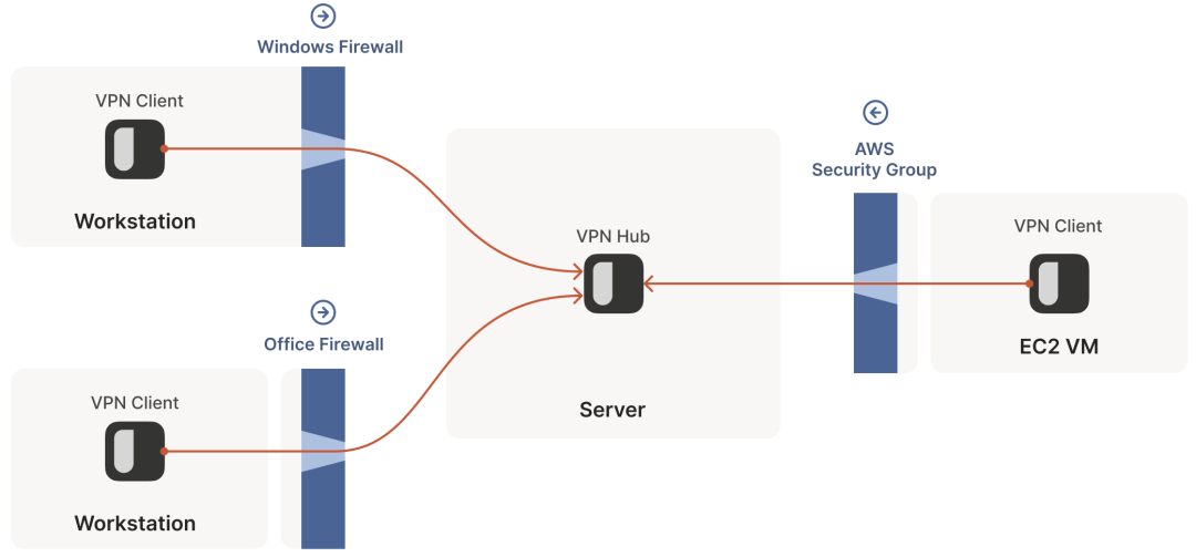 但上图是 假设了 通信双方中,其中一端**(服务端)是能直接访问到的**。在 VPN 场景中,这就形成了所谓的 hub-and-spoke 拓扑 :中心的 hub 没有任何防火墙策略,谁都能访问到;防火墙后面的 spokes 连接到 hub。如下图所示: