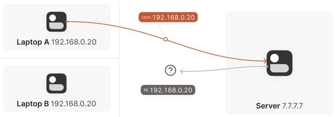 这一步就好像笔记本有一个公网 IP 一样,但源地址 192.168.0.20 是私有地址, 只能出现在私有网络,公网不认,收到这样的包时它不知道如何应答。