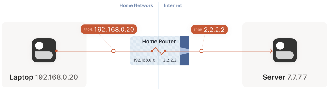 在它 自己的公网 IP 上挑一个可用的 UDP 端口 ,例如 2.2.2.2:4242 , 然后创建一个 NAT mapping : 192.168.0.20:1234 <--> 2.2.2.2:4242 , 然后将包发到公网,此时源地址变成了 2.2.2.2:4242 而不是原来的 192.168.0.20:1234 。因此服务端看到的是转换之后地址, 接下来,每个能匹配到这条映射规则的包,都会被路由器改写 IP 和 端口。 反向路径是类似的,路由器会执行相反的地址转换,将 2.2.2.2:4242 变回 192.168.0.20:1234 。对于笔记本来说,它根本感知不知道这正反两次变换过程。