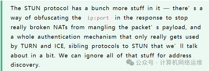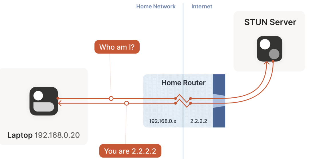 笔记本向 STUN 服务器发送一个请求:“从你的角度看,我的地址什么?” STUN 服务器返回一个响应:“我看到你的 UDP 包是从这个地址来的: ip:port ”。