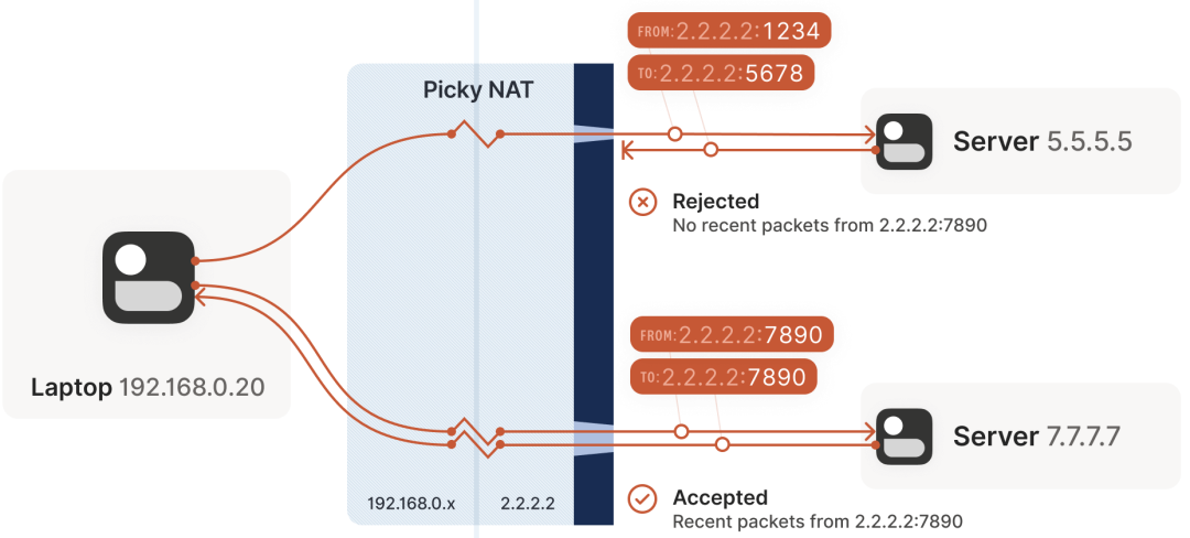 但其实这些术语 相当让人困惑 。我每次都要 查一下 Restricted Cone NAT 是什么意思。从实际经验来看,我并不是唯一对此感到困惑的人。例如,如今互联网上将 “easy” NAT 归类为 Full Cone,而实际上它们更应该归类为 Port-Restricted Cone。