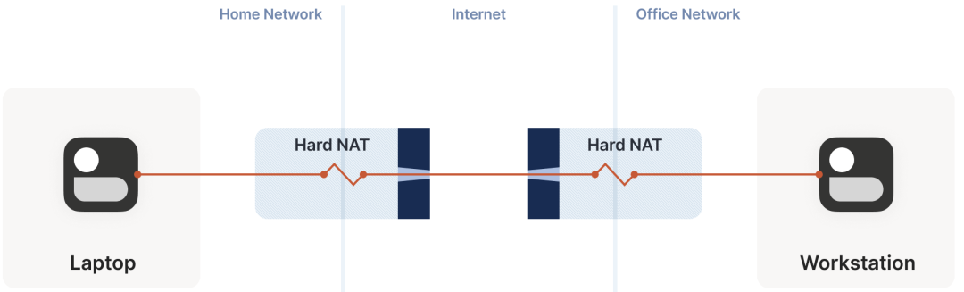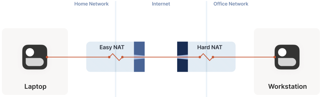 这显然对用户不友好,在像 Tailscale 这样的 mesh 网络中的扩展性也不好,在 mesh 网络中,我们假设对端会以一定的粒度在公网上移动。 此外,在很多情况下用户也没有防火墙的控制权限:例如在咖啡馆或机场中,连接的路 由器是不受你控制的(否则你可能就有麻烦了)。 因此,我们需要寻找一种不用重新配置防火墙的方式。