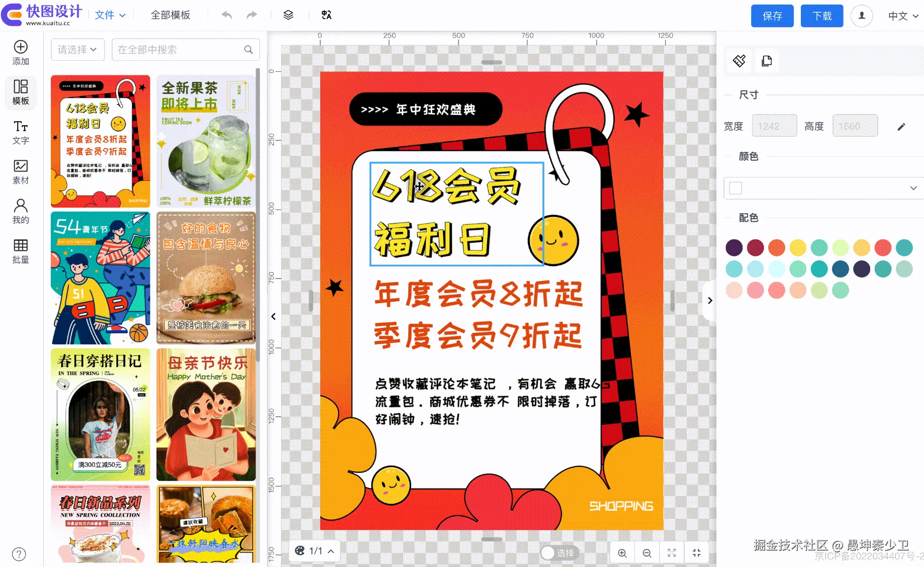 这类应用的核心功能在于自定义画布尺寸和元素排版,得益于fabric.js的原生支持,实现起来相对简单。我们主要工作是开发直观的属性编辑面板,使用户能够便捷地调整所选元素的文字和图片属性。