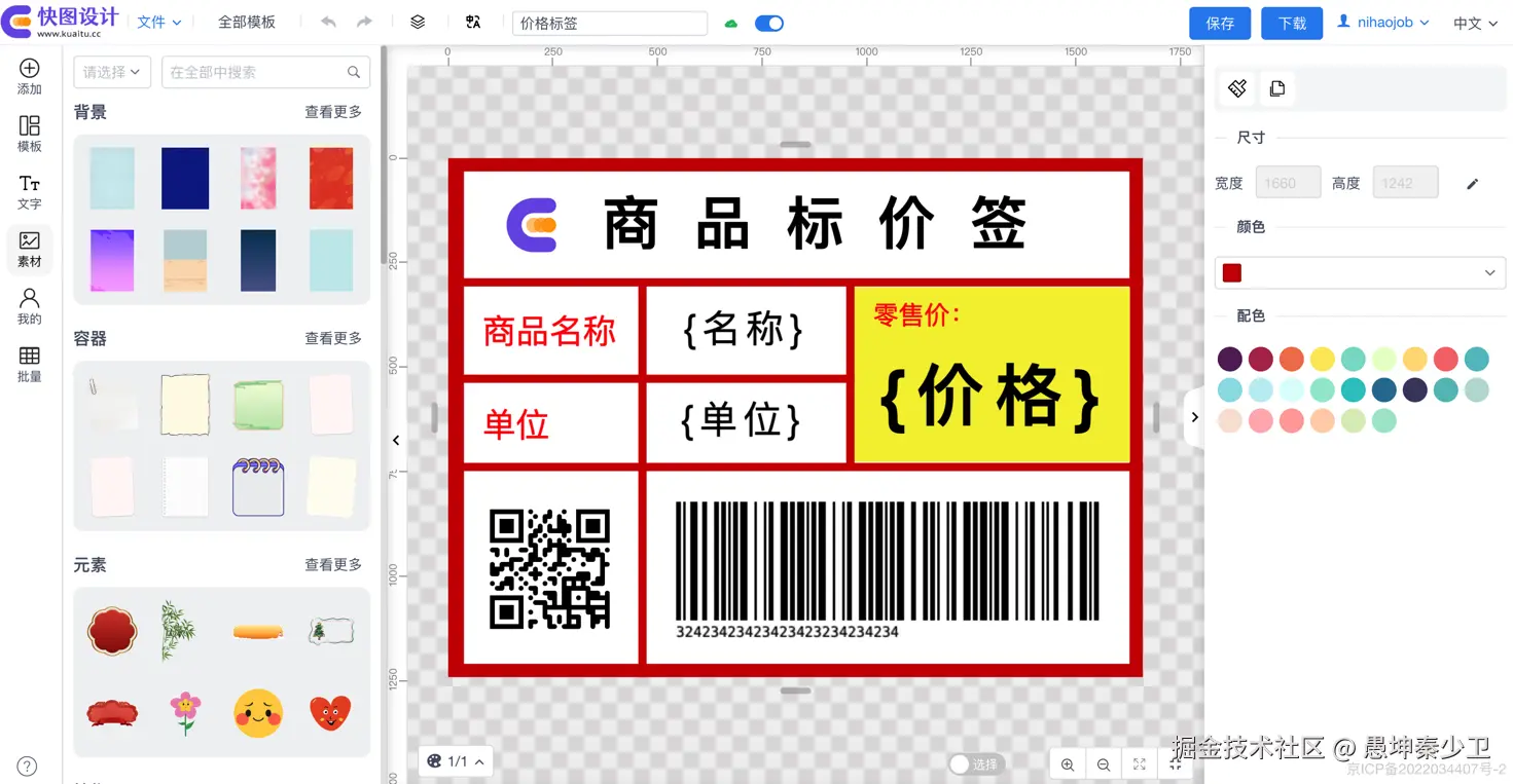 这种项目主要的工作量在交互上,如何将画布中的文字和图片元素与表格中的数据一一对应,并批量生成,另外会有一些细节,比如条形码的尺寸、图片的尺寸如何与画布中的尺寸比例进行匹配,这些细节需要我们自己实现。
