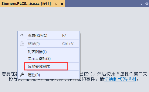 4在设计界面的空白处,右击弹窗中,选择添加安装程序
