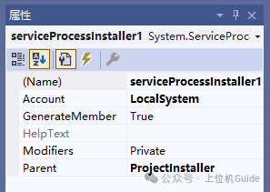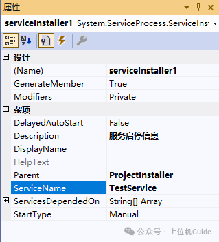6、选择serviceInstaller,在右侧的属性进行设置,主要可以设置以下属性: