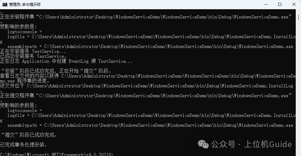 installutil C:\Users\Administrator\Desktop\WindowsServiceDemo\WindowsServiceDemo\bin\Debug\WindowsServiceDemo.exe